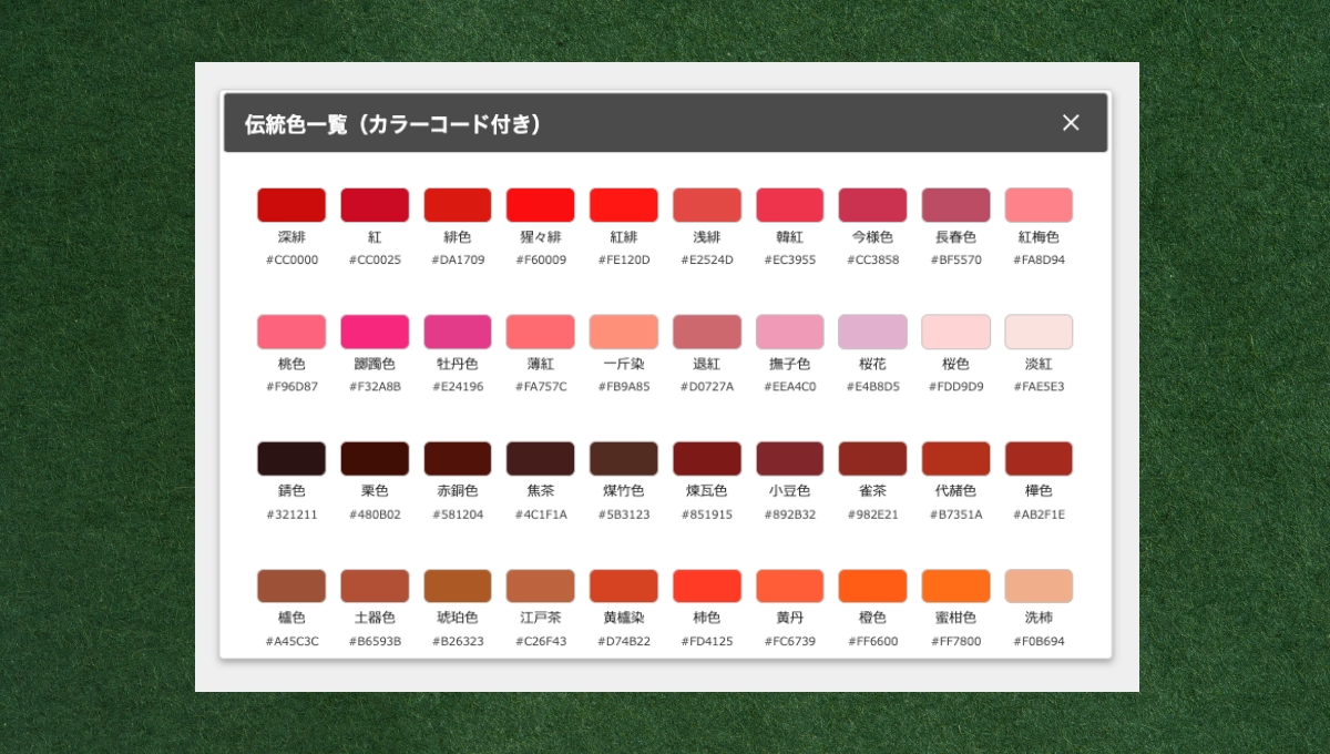(例:茜色、瑠璃色、抹茶色)から、感性に響く配色を実現できます。