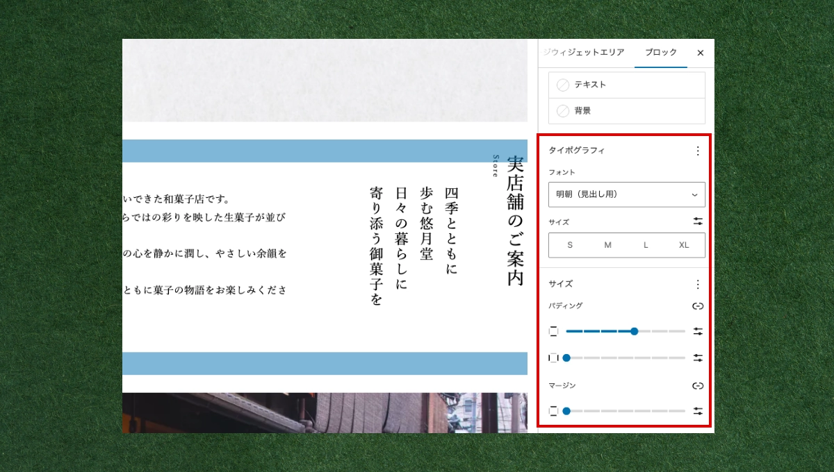 ブロック単位でパディング・マージンの余白調整、明朝体・ゴシック体 の切り替えが可能。