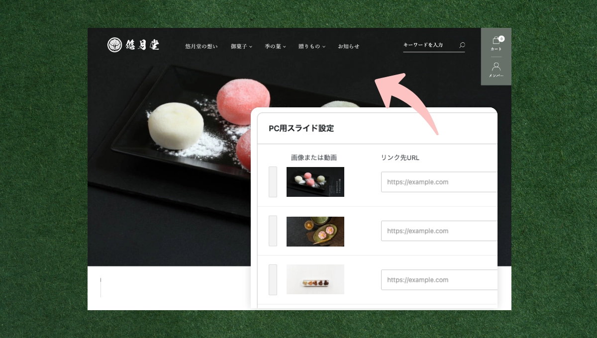 トップページに最大5枚までスライドを簡単に設定。PCとスマホに最適な画像や動画を使い分けて、ブランドの世界観を演出できます。