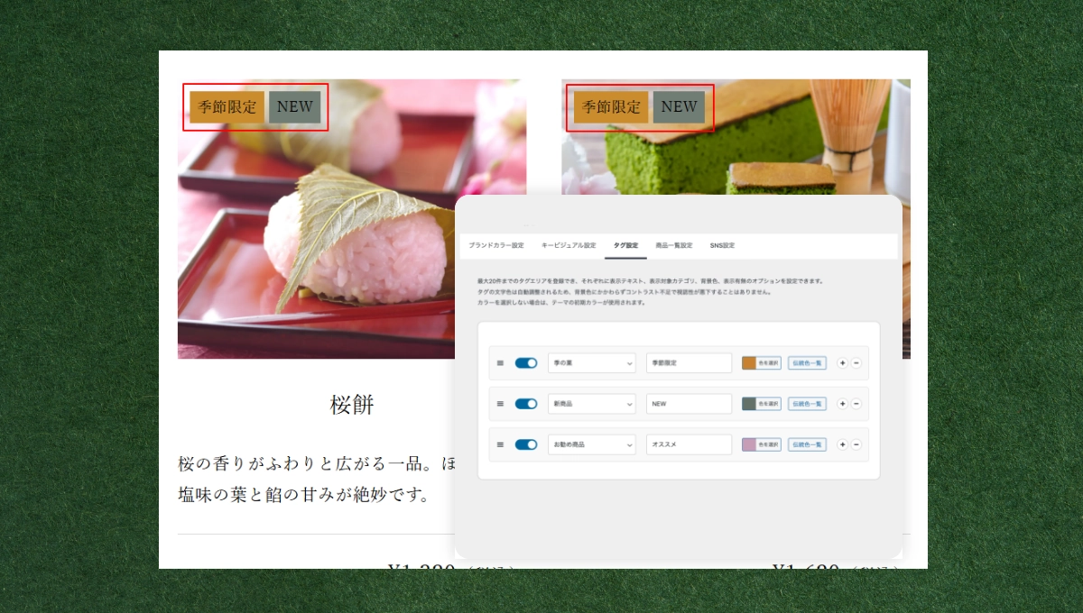 「アウトレット」や「限定品」などのタグを最大20件まで登録可能。表示するカテゴリーや色を設定でき、目立たせたい商品を直感的にアピールして購買意欲を高めます。