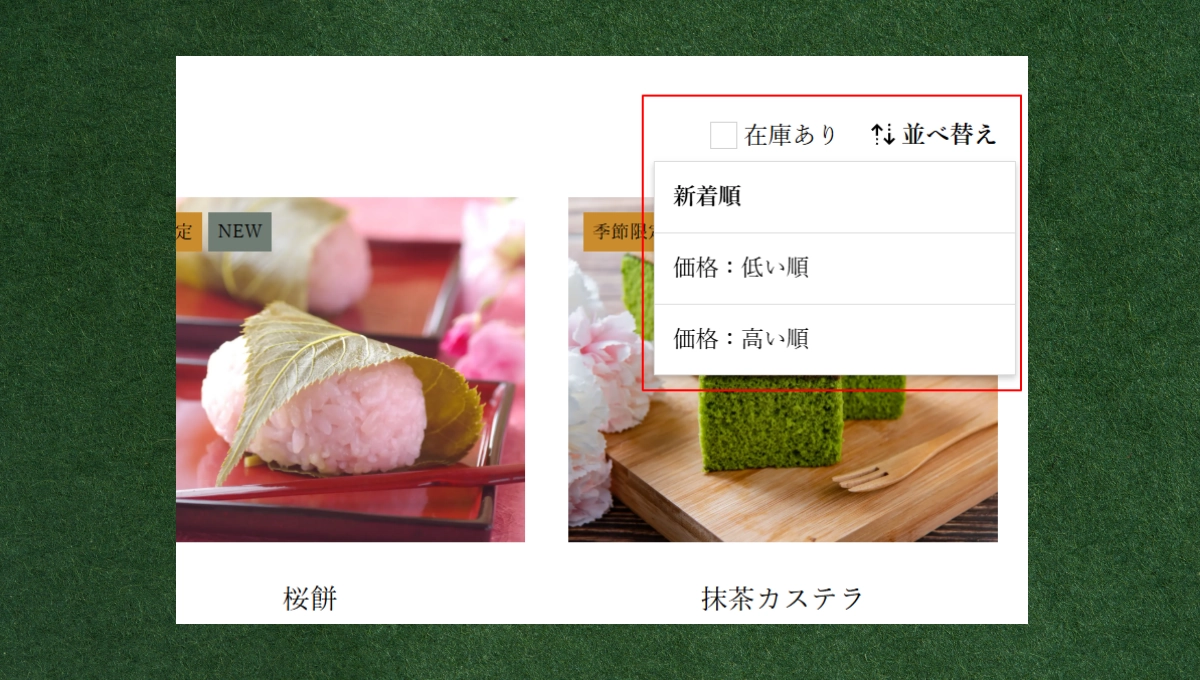 価格順・新着順での並び替えや、「在庫あり」商品のみを表示できるフィルター機能を搭載。商品一覧ページでの表示有無も選択でき、ユーザーが目的の商品をスムーズに見つけられる快適な購入体験を実現します。