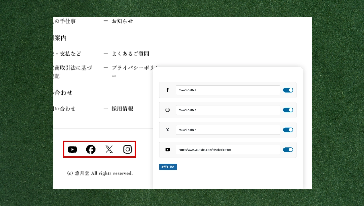 Facebook、Instagram、X、YouTube のSNSアイコンを簡単に設置可能。サイト訪問者への情報発信やファンづくりをスムーズにおこなえ、集客やブランディングに役立ちます。