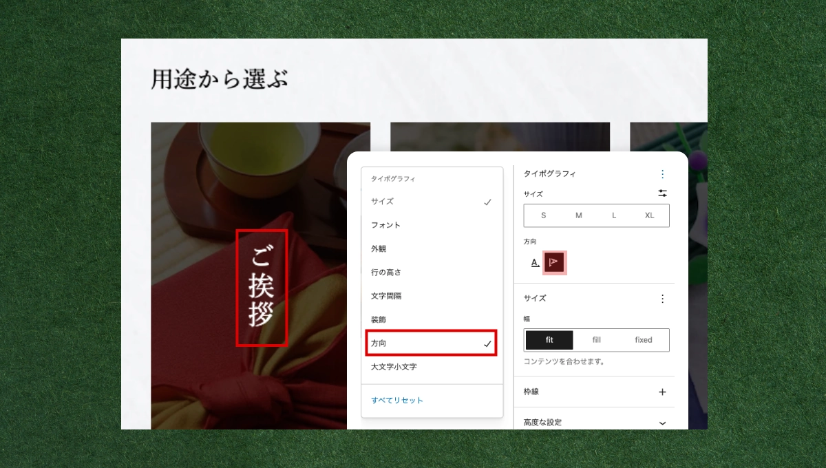 ウィジェットブロックやブロックエディターで、見出しや本文を縦書き表示に設定可能。