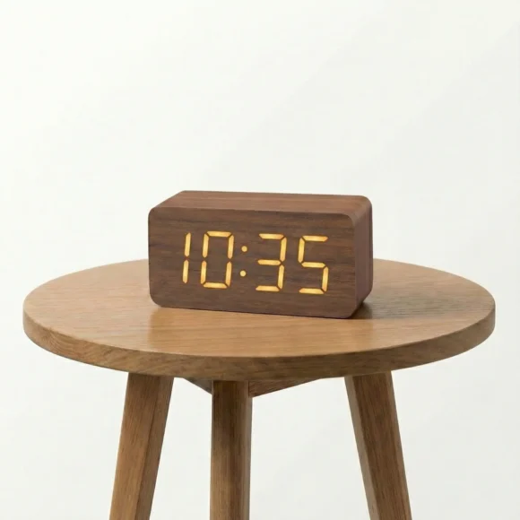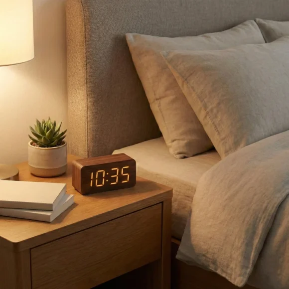 画像にある時計を、寝室のベッド横にある木製のサイドテーブルの上に配置してください。サイドテーブルの上には時計のほかに、文庫本2冊と、小さな観葉植物を置いてください。