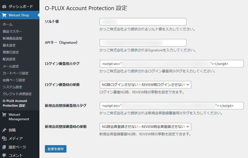 Welcartの管理画面に追加された設定項目で、O-PLUXの契約情報を入力・設定します。あわせて、不正アクセスが検知された(REVIEW/NG)際の挙動(ログインや会員登録をさせるかさせないか)を選択すれば、すべての設定は完了です。