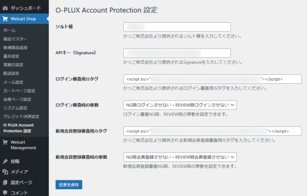 WCEX O-PLUX Account Protection を有効化すると、Welcart Shop メニューに「O-PLUX Account Protection 設定」が追加されます。全ての値を入力し、「変更を保存」ボタンをクリックして保存してください。