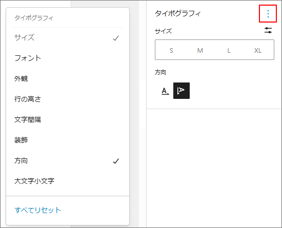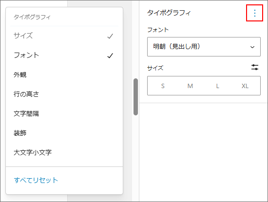 「サイズ」以外は、通常表示されていません。「︙(三点リーダー)」をクリックすると設定項目を表示してください。